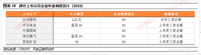 由于企业年金设计差异较大,暂时无法根据整体缴费水平推算职工个人和企业的实际缴费水平。部分上市公司在年报中披露了企业年金缴费设计,整体看设计模式各不相同。缴费基数方面,以当年工资或上年工资为基数的计划设计均存在;个人缴费方面,既有定额缴费,也有按比例缴费或不缴费;企业缴费方面,多数企业采用按比例缴费的方法,但比例差异较大。具体如图表16所示。