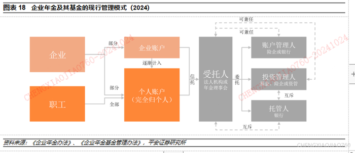 企业年金方面,企业年金计划筹集的资金及其投资运营收益被用于建立企业年金基金。企业年金基金由受托人负责选择、监督、更换账户管理人、投资管理人、托管人,并制定战略资产配置等;账户管理人负责建立账户、记录缴费和投资收益、计算年金待遇等;投资管理人负责投资等;托管人则负责账户管理、向投资管理人分配年金基金财产等。具体如图表18所示。