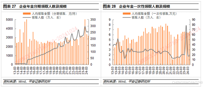 同时,每季度也有10-20万人一次性领取企业年金,领取金额平均为6万元/人,相当于分期领取2年水平。领取方式间的待遇差异,可能是由于一次性领取人群多为参与企业年金计划较短,积累水平不高(如工作后不久出国定居)的人群为主。