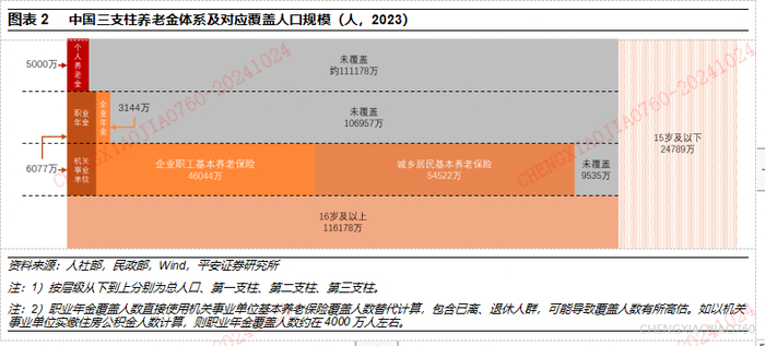 第二支柱覆盖水平偏低,不足1亿人。截至2023年末,中国企业年金约覆盖3144万人,职业年金覆盖人数则缺乏披露。但由于职业年金为强制性参与,我们可以将机关事业单位基本养老保险的参保人数,视同职业年金的参保人数。按此计算,职业年金约覆盖6077万人。二者合计,第二支柱约覆盖9221万人,占第一支柱基本养老保险覆盖人数的8.65%,占16岁及以上人口的7.94%。