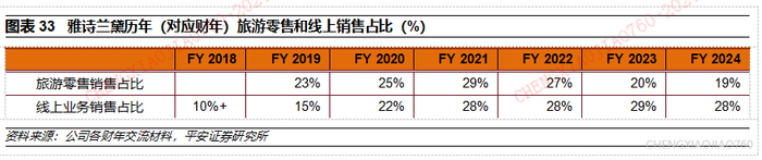 雅诗兰黛2024财年(2023-7-1至2024-6-30,雅诗兰黛每财年对应时间为上年7月1日至当年6月30日,下同)实现营收156.1亿美元(相较上年同期的159.1亿美元同比下降1.9%),有机下滑1.7%(几乎所有区域的收入和营业利润都受到美元强势的影响),主要是由于中国大陆地区高端美妆消费的持续疲软和上半财年亚太区旅游零售下滑(在较低转化率环境下旅游零售渠道去库存,图表2已显示雅诗兰黛各区域业务表现;公司不断在调整在中国海南地区的库存周转情况,同时公司计划在海南建立一个分销中心,缩短旅游零售订单和配送时间)。根据公司业绩交流材料,2024财年公司旅游零售收入占比为19%(2022、2023财年时占比分别约为27%和20%,2025年比例会有所收缩),线上业务收入占比为28%(2023财年占比为29%,基本和上年持平)。2024财年雅诗兰黛净盈利3.9亿美元,上年同期为10.1亿美元。