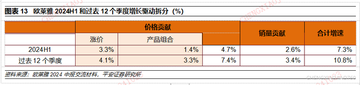 根据中报电话会议交流,上半年欧莱雅线上线下均衡增长,增速分别为7.8%和7.2%。量和价对增长均有贡献,电话会议材料显示,2024H1的销量在上年同期增长4.9%的基础上增长2.6%;价格增长4.7%,其中有3.3%是涨价因素,1.4%是产品组合因素;过去12个季度欧莱雅也实现量价均衡增长。