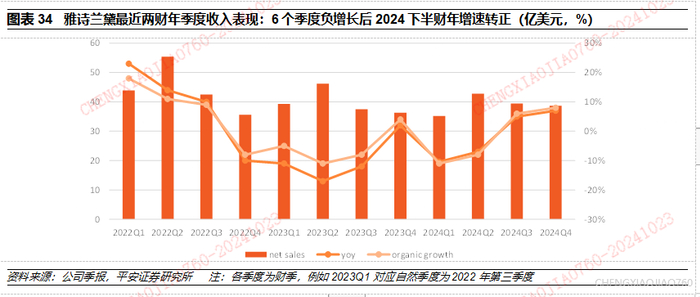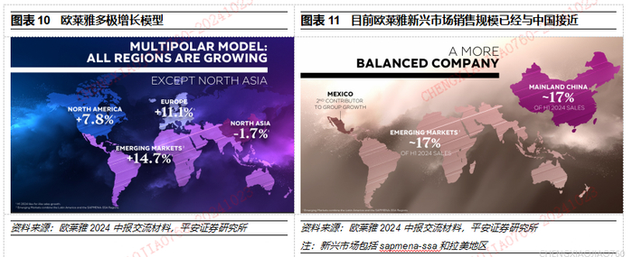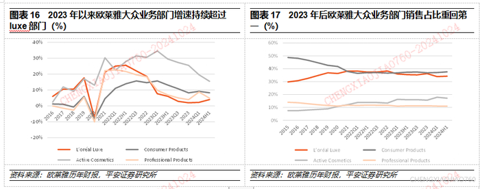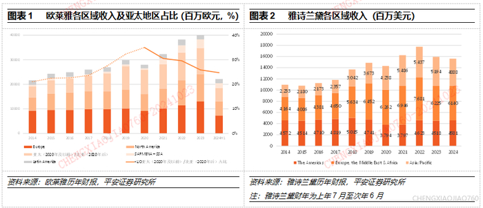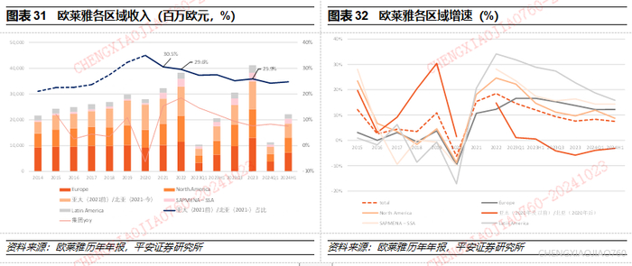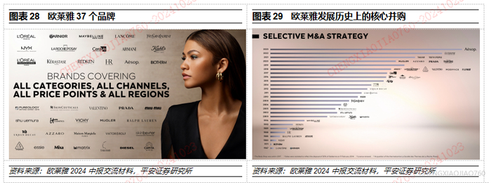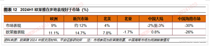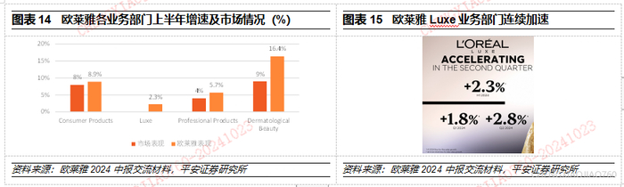 欧莱雅和雅诗兰黛在2023、2024年均受益于西方、欧洲市场的较好表现和新兴市场(拉美等地区,特别是巴西、墨西哥等地)的强劲增长。