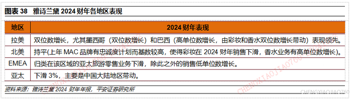 在各区域中,雅诗兰黛在拉美市场有双位数增长,特别是墨西哥和巴西地区有领先表现;北美地区持平(美国地区的增速尽管还在中高个位数但在第四财季逐月提升,零售额开始恢复增长,份额有所回升,7月零售额在香水和护发双位数增长驱动下增速为中个位数,护肤也为中个位数增长);欧非中东(EMEA)市场同比-2%,主要是亚洲旅游零售业务下滑(业务分类在欧非中东地区,全球旅游零售销售有高单位数下滑,其中上半财年下滑较多,下半财年基于上年较低基数而恢复增长),旅游零售业务以外销售有低单位数增长;亚太地区业务下滑3%,主要是中国大陆地区带动,中国香港特别行政区和韩国市场有双位数增长。