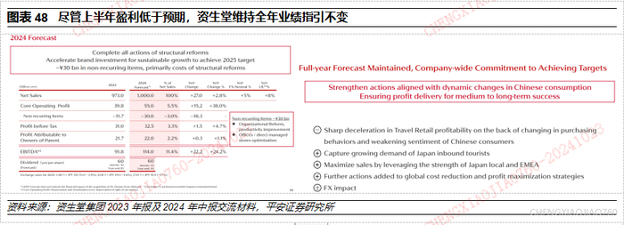 资生堂2024H1核心经营利润下降88亿日元至193亿日元(同比-31.3%),非经常性利润影响为-220亿日元,包括Q1的201亿日元重组成本(主要是提前退休激励计划成本),Q2非经常性损失19亿日元包括组织优化和中国市场的关店相关成本;全年预计的非经常性损失为300亿日元,目前看预计无较大偏差。因此H1公司经营利润为-27亿日元,上年同期为136亿日元),上半年归母净利润为0.0亿日元。尽管上半年如此,根据公司中报交流,全年利润指引不变,将通过抓住日本入境旅客的需求、实现日本本土和EMEA优势区域销售的最大化等举措努力实现550亿日元的核心经营利润(原本预计上半年要实现全年核心经营利润的40%即220亿日元,实际完成193亿日元,即低于预期约30亿日元,其中Q1超过预期约百亿日元,但Q2低于预期约60亿日元。由于收入减少,美洲和旅游零售市场的核心经营利润都与预期有一定差距,中国市场收入虽然也下滑但成本下降;日本和EMEA市场很好地达成了业绩预期)。