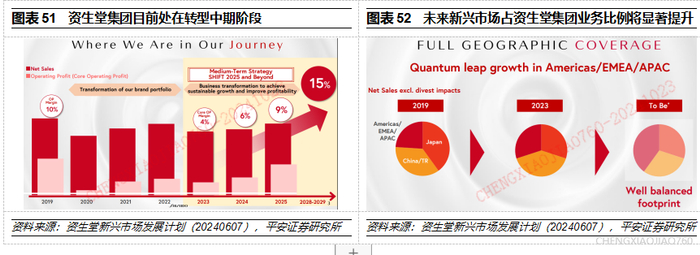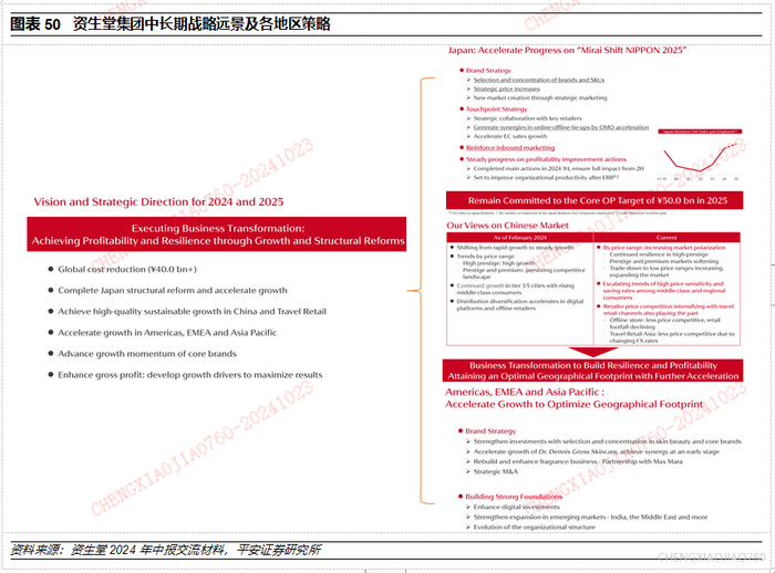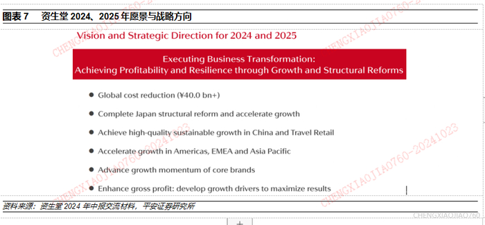 2024年2月公司宣布要在2025年前完成业务转型,实现可持续利润增长、建立强韧性的业务结构。降本增利定量目标即上文提及的2024和2025年合计400亿日元。公司首先将重点放在日本市场的业务结构转型,其次是实现中国市场和旅游零售业务的高质量增长,美洲、EMEA和亚太区则计划加快增速(包括对外合作和战略并购方式),提高核心品牌的增长动能,实现毛利最大化。