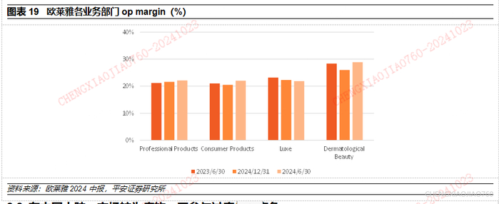 分地区看,上半年欧莱雅在欧洲和新兴市场(包含拉美和sapmena-ssa,后者即South Asia Pacific, Middle East, North Africa, Sub-Saharan Africa)有双位数增长,北美市场保持正常节奏,北亚地区销售下滑1.7%(报告口径-3.1%)。中国大陆由于消费者信心持续低迷,二季度美妆市场负增长(且去年有较高基数),但上半年欧莱雅获得低个位增速,继续抢占市场份额,主要得益于皮肤美容、专业美妆和luxe部门继续突破。集团旅游零售业务仍然在拖累增长,但势头持续在改善。日本市场双位数强劲增长。