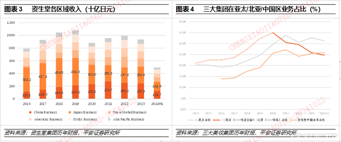 欧莱雅、雅诗兰黛、资生堂为全球聚焦在美妆领域的三大集团,2023年欧莱雅收入411.83亿欧元,雅诗兰黛2024财年(对应2023年7月至2024年6月)收入为156.08亿美元,2023年资生堂收入为9730.38亿日元(对应约65亿美元)。2017年起三大集团均随着中国区业务的快速增长而扩张,但2021年后开始出现不同的走势:欧莱雅继续稳定增长,虽然增速放缓但韧性十足,雅诗兰黛在亚太区高端美妆及旅游零售市场(归类在欧非中东区域)的拖累下表现较弱,资生堂集团开启聚焦高端路线。