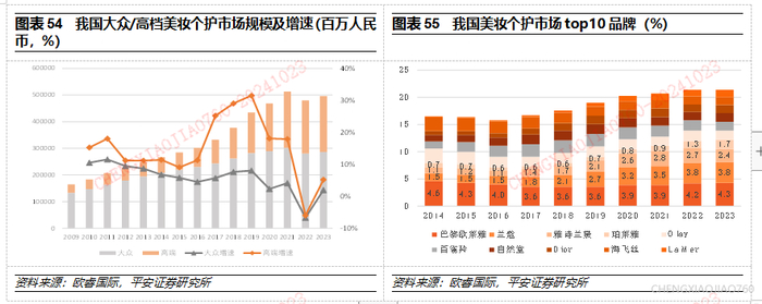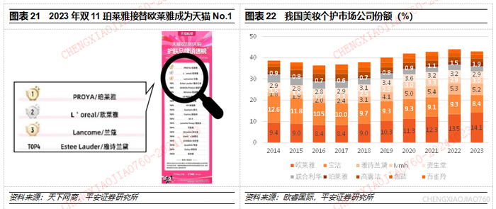 珀莱雅正是从2023年3.8大促开始接替欧莱雅成为天猫美妆榜单第一,双十一大促继续位列第一。根据欧睿数据,珀莱雅在2022年第一次进入我国美妆个护市场top10之后在2023年进一步前进至第7名。欧莱雅在我国美妆市场的市占率仍在提升,2023年为14.1%,2019年是市场份额约10.3%(同期珀莱雅市场份额从0.8%提升至1.9%)。
