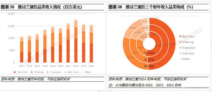 2024财年雅诗兰黛护肤和彩妆业务分别同比-3%和-1%(均为有机增速口径,报告口径分别为-4%和-1%)至79.08和44.70亿美元;香水业务报告有机增长2%(报告口径增长2%)至24.87亿美元,护发业务则同比下降4%(报告口径和内生口径均-4%)至6.29亿美元。护肤业务在2022年比例为56%,近两年随着彩妆和香水业务的恢复、护肤业务的下滑,护肤业务比例下降至51%,彩妆和香水业务在2024财年销售占比分别为28%和16%,公司护肤和彩妆业务合计占比约在80%左右。