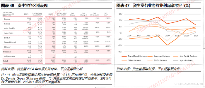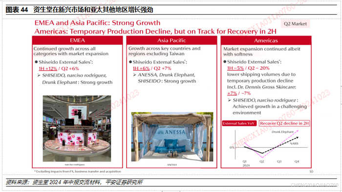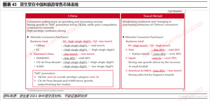 中国市场Q2同比-9%,其中中国大陆地区-10%到-15%,618抖音平台有较高增长但价格竞争持续激烈,在此环境下,公司坚持以品牌而非低价驱动销售,避免对极低价格销售的依赖。品牌方面,SHISEIDO主品牌受核废水影响很大。旅游零售业务Q2则同比-15%。