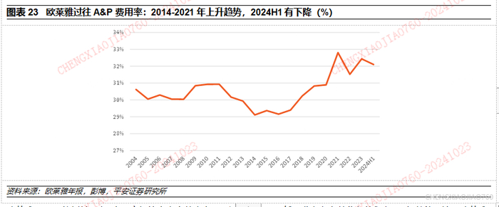 根据欧莱雅电话会议,过去由于旅游零售的干扰,中国区推广与促销费用(Advertising and promotion,以下简写做A&P)率是所有区域中最高的,而上半年考虑中国市场消费者信心,欧莱雅减少了原计划的一部分投放,但除北亚区以外,其余地区相对提高了这一费用率,整体使得公司的A&P费用率相比去年同期减少40bp(即0.4pct)至32.1%(还有部分因素为上年同期8月收购了伊索,此外2024H1还有阿根廷和土耳其等地的恶性通胀的影响),反观2014年后公司整体A&P费用率是上升趋势。