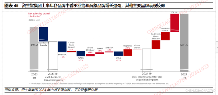过去资生堂的增长主要是靠日系护肤品牌驱动,目前公司正在通过重整产品组合来应对市场环境变化,用一些全球化的品牌例如NARS等来替换更新品牌组合,此外香水品类也被视为一个增长机会。中国市场上本土品牌的优势在增强,产品和营销的竞争力都在提升,特别是核废水之后,本土品牌发展很好(抢占了部分日系品牌的份额)。因此公司现在计划培育高功效、高端品牌,例如资生堂主品牌下的晶钻奢宠系列FUTURE SOLUTION LX;另外公司将培育高性能的面霜和精华,现在公司正在制定一个计划来实现更有效的和更具竞争力的品牌,而不是在中国本土品牌更有竞争优势的领域参与竞争。当前资生堂集团最受竞争影响的领域是中高端领域,如Elixir和AUPRES等,之前这些品牌有日系品牌优势但现在其市场份额正在被稍微便宜的当地品牌抢夺。公司称在这一细分市场中需要重新审视产品组合来确定可以获胜的产品类别,也需要一个战略来赢得这部分市场,但当前并未明示这些战略(我们预计公司将在11月新的战略发布会上有所明示)。同时,公司也提及投资需要更高效,也需要在结构改革方面更进一步,现在主要还是日本产品出口到中国市场,公司需要更加本土化以灵活地应对中国市场,面对本土品牌时也才能更有竞争力。