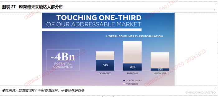 全球美妆市场潜在目标人群约有40亿人(大约一半人口),目前欧莱雅只触及到其中1/3的消费者,在发达国家触达率很高,接近60%,而在新兴市场国家大约只触达了25%左右,在北亚区触达率低于15%。