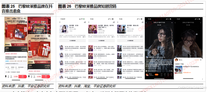 也因此我们看到,尽管欧莱雅宣称不过度参与中国市场的价格竞争,但仍然在做积极的本土化运营、向更广阔的人群渗透。在抖音上欧莱雅集团旗下巴黎欧莱雅品牌推出玻色因水乳套盒,同时,在上美股份旗下韩束品牌通过微短剧在抖音获得大量曝光、并在销售额方面有明显突破(据上美股份,2023年公司收入42.13亿元,2024H1为35.42亿元,其中韩束品牌在2023年和2024H1收入分别为30.90亿元和29.27亿元)后,巴黎欧莱雅品牌玻色因水乳、气垫开始试水短剧营销。
