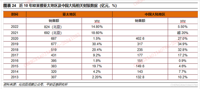 但值得我们强调的是,2017年起亚太地区是欧莱雅最核心的增长动力,2020年疫情影响较大,2021年欧莱雅将北亚区单独划分,2022年北亚区也依然是较大体量下的较高增长(当年北亚区销售113.21亿欧元,占比为29.6%,仅次于欧洲地区的29.9%,北亚区当年增速为14.78%)。根据“化妆品观察”公众号援引的欧莱雅亚太区及我国大陆地区相关数据,2017年、2020年欧莱雅在我国大陆地区的销售额分别为177亿元和402.6亿元,2021、2022年未单独披露我国大陆地区情况,但当年同比增速分别为超20%和5.5%。欧莱雅在2023年财报交流中表示在我国大陆地区的出货额同比增长5.4%,终端销售同比增长5.7%,2024H1我国大陆地区销售占比达到17%;按此匡算(考虑我国大陆地区以外的市场2024H1快速增长,2023全年我国大陆地区占比应该高于17%),欧莱雅2023年我国大陆地区销售收入超过70亿欧元。我们倾向于认为,目前欧莱雅在我国地区的增速是多年较高速增长之后重新与消费者美妆消费增速再平衡。