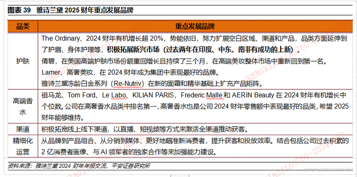 雅诗兰黛则预计2025财年(对应2024-7-1至2025-6-30)全球高端美妆市场同比增长2-3%(预计西方市场带动增长,东方市场内部对冲而整体相对温和),假设中国市场可以在2026财年逐渐稳定并开始增长,预计2026年全球高端美妆重新加速至历史的中个位数增长。