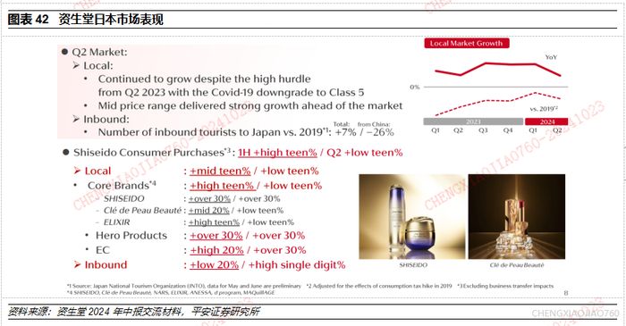 日本市场在涨价前的Q1有激增的需求,同时2023年5月日本将COVID-19下调为5级,Q2基数相较Q1有所提升,尽管整体还未恢复至2019年同期水平,但集团表现已较为强劲,尤其是在大众市场表现优于行业。根据资生堂中报交流材料援引自日本旅游组织(Japan National Tourism Organization,JNTO)的数据,入境日本游客已经超过2019年约7%,中国游客大约恢复至2019年的74%,入境游客业务在Q2增速有所放缓(上半年同比增速为20-25%,其中Q2为高单位数增长),尽管难以完成全年同比增长60%的目标(年初制定的2024年计划为入境市场收入增长超过60%,本土市场增长中单位数),但公司希望通过强劲的日本本地业务来弥补。