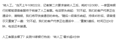 类似情况不只发生在通信服务行业,曾有媒体记者测试过多个平台的转人工服务的耗时。