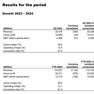 前三季度实现营收757.48亿丹麦克朗(约合109.65亿美元),同比增长8.3%;息税及特殊项目前利润87.85亿丹麦克朗(约合12.72亿美元),同比下降15.0%。