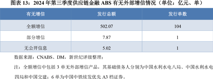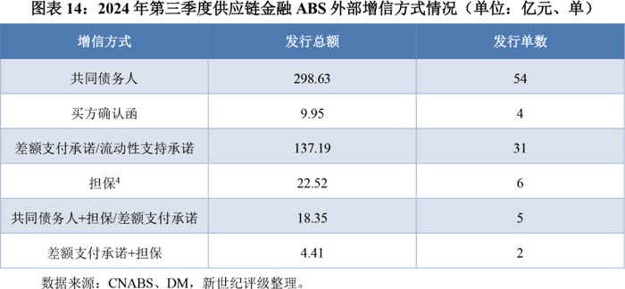 根据CNABS中已公开披露的增信结构所示,2024年第三季度发行的全额增信的供应链金融ABS共计104单,发行规模502.07亿元,其中核心企业通过对应付账款逐笔出具付款确认书成为共同债务人的资产证券化产品共计发行54单,发行规模为298.63亿元。