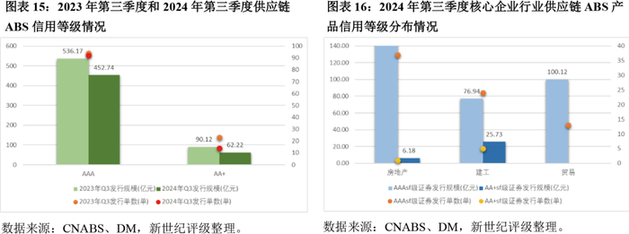 2024年第三季度供应链金融ABS市场(包括交易所ABS和ABN)整体发行规模和发行单数同比均呈现下降趋势;核心企业主要分布在房地产、建工及贸易行业,不同行业内核心企业头部效应明显;交易结构仍以外部全额增信为主,少数涉及部分增信(对中间层证券提供增信);信用等级仍以AAAsf为主,整体信用风险维持较低水平。