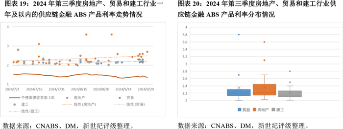 2024年第三季度发行的期限在一年及以内的供应链金融ABS中,整体发行利率随国债收益率波动向下,房地产行业利率表现出更大的波动性,较为分散,部分地产供应链ABS其较高的融资成本与民营房企信用风险持续暴露有关。