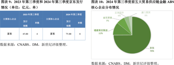 截至2024年9月末,京东于2024年第一季度获批的“京东科技-京诚系列12号1-10期”80亿储架式注册额度已发行完毕,并于2024年8月受理“京东科技-京诚系列13号1-10期”80亿储架式注册发行额度,已于10月获批。当期贸易供应链发行总规模为100.12亿元,较上年同期增长86.39%,京东仍为发行主力。
