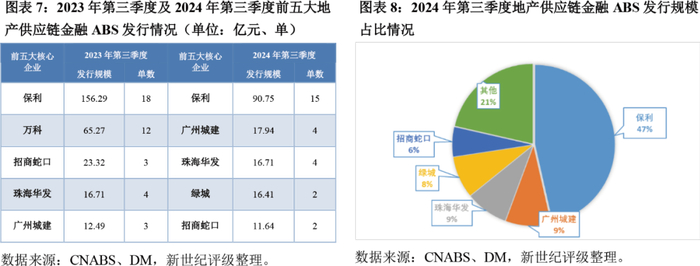 2024年第三季度,地产供应链ABS发行规模仍以保利为首,当期发行90.75亿元,随着地产行业风险蔓延,房地产企业总发行规模同比仍持续下降。