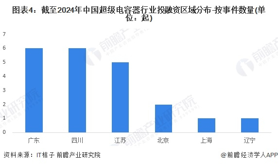 从行业企业融资区域来看,近年来全国超级电容器行业投融资事件集中广东、四川、江苏、北京、上海、辽宁等省市,其中广东和四川发生投融资事件数量均为6起,居全国首位。