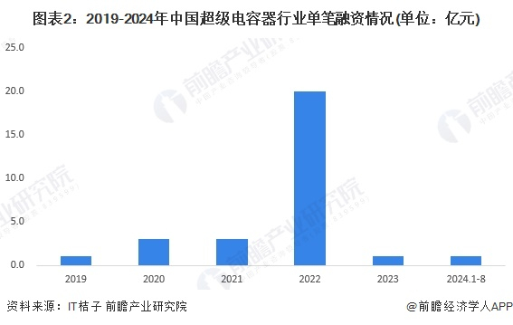 从已公布的单笔融资金额来看,2019-2024年国内超级电容器行业最高单笔融资金额发生在2022年,达20亿元。