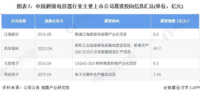 2022年4月,国内超级电容器行业代表性公司风华高科发布公告,称拟向不特定合格投资者公开发行股票,本次非公开发行股票募集资金总额不超过50亿元,拟投向以下项目:祥和工业园高端电容基地建设项目、新增月产280亿只片式电阻器技改扩产项目。
