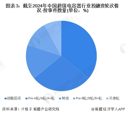 从超级电容器行业的投融资轮次分析,截至2024年8月中国超级电容器行业发生的投融资事件中,战略投资和Pre-A轮/A轮/A+轮事件数量最多,分别达9起和7起,占总事件数的36%、28%。