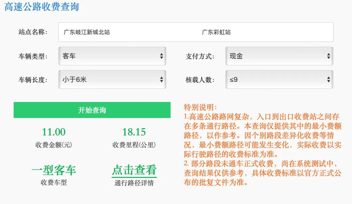 至于岐江新城北到彩虹,就是经由南中高速到深中通道南沙线,显示收费里程为18.15公里,现金收费11元,粤通卡收费10.34元。