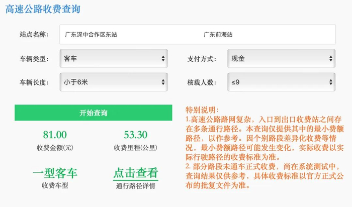 从深中合作区到深圳前海,经由南中高速-深中通道-广深沿江高速通行,显示收费里程为53.30公里,现金收费81元,粤通卡收费76.48元。也就是说,待到南中高速开通后,不到80元就可从深中合作区到深圳前海。