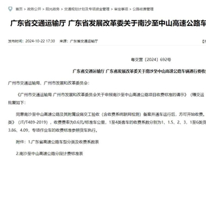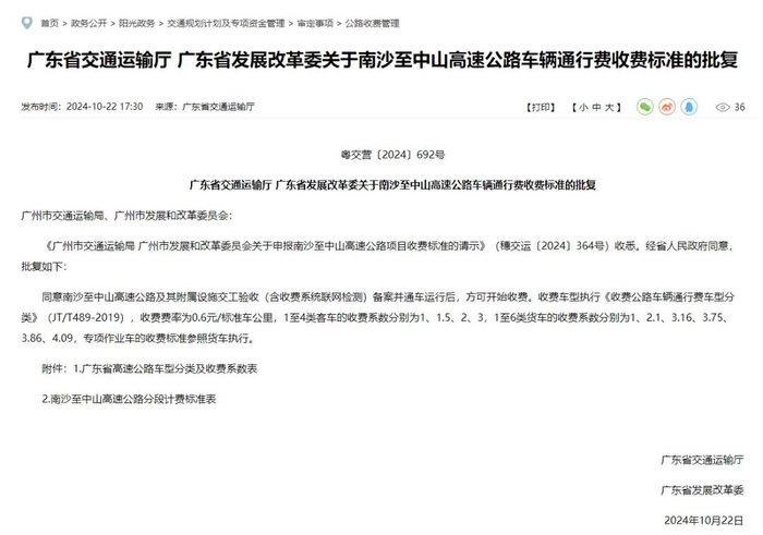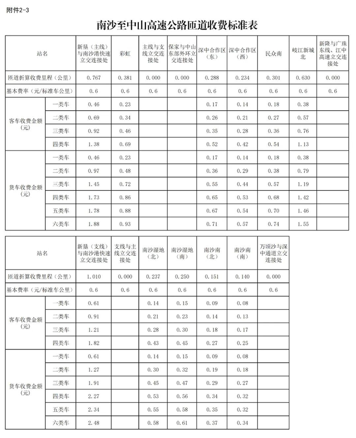 同意南沙至中山高速公路及其附属设施交工验收(含收费系统联网检测)备案并通车运行后,方可开始收费。收费车型执行《收费公路车辆通行费车型分类》(JT/T489-2019),收费费率为0.6元/标准车公里,1至4类客车的收费系数分别为1、1.5、2、3,1至6类货车的收费系数分别为1、2.1、3.16、3.75、3.86、4.09,专项作业车的收费标准参照货车执行。