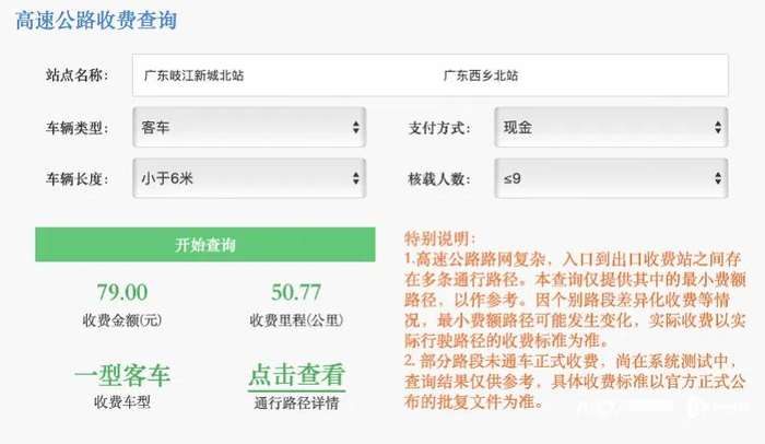 按照这个标准计算,一类客车从岐江新城北站到西乡北站收费为79元现金,总计收费里程50.77公里。