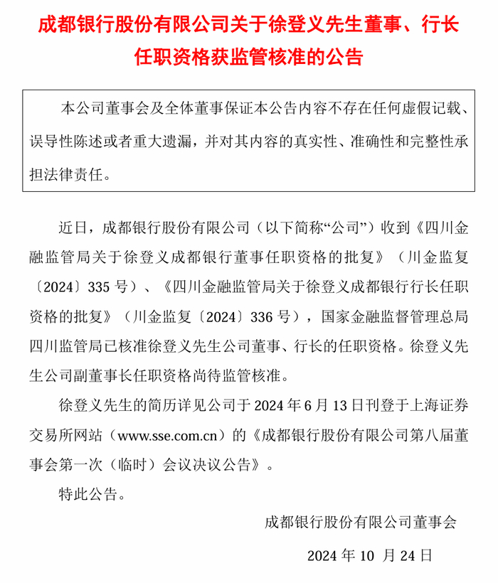 10月23日,成都银行发布公告称,该行近日收到批复,国家金融监督管理总局四川监管局已核准徐登义先生公司董事、行长的任职资格。徐登义先生副董事长任职资格尚待监管核准。