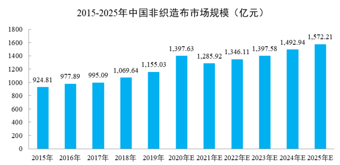 2015-2019 年,我国非织造布市场规模呈现逐年增长态势,其中 2019 年行业市场规模达到 1,155.03 亿元,同比增长 7.98%。2020 年受新冠疫情影响,市场对无纺布等原材料的需求激增,根据前瞻研究院预测,2025 年非织造布市场规模将达到 1,572.21 亿元。