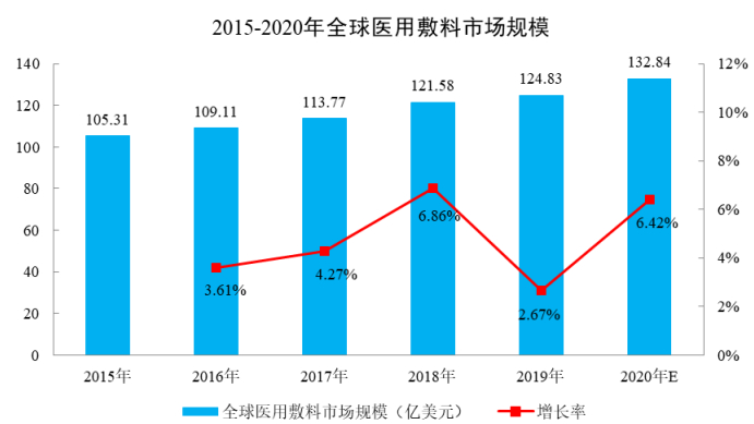 近年来,全球医用敷料市场规模基本保持稳定增长。根据市场调研机构 BMIResearch 的数据,2015-2019 年,全球医用敷料市场规模由 105.31 亿美元增长至124.83 亿美元,预计 2020 年全球医用敷料行业市场规模将达到 132.84 亿美元。