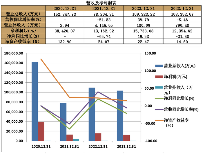 业绩情况2020-2023年底,公司的营业收入分别为162347.73万元、78204.31万元、109323.22万元、103352.67万元,年均复合增长率为-10.68%;归母净利润分别为38426.07万元、13162.92万元、15733.68万元、12354.62万元,年均复合增长率为-24.70%