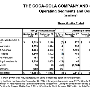 10月23日,该公司发布2024年第三季度业绩。财报显示,当期,可口可乐营收118.54亿美元(约合人民币845.1亿元),同比下滑1%,但超出市场预期的116.1亿美元;净利润28.5亿美元(约合人民币203.18亿元),同比下滑8%。