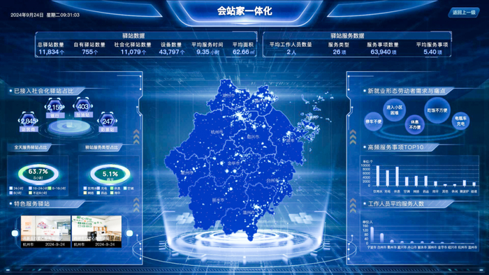 整合资源提升服务效能。围绕落实浙江省总工会《深入推进新就业形态劳动者工会工作三年行动计划(2023—2025年)》,通过自建、共享等方式,整合工会内部和社会化资源,打造线上服务平台,高效开展各类普惠服务。接入全省工会自有驿站755家、社会化驿站11079家,按照“会、站、家”一体化运转模式,配备饮水机、冰箱、微波炉、充电器、空调等设施设备,让新就业形态劳动者累了能歇脚、渴了能喝水、饿了能热饭、没电能充电、闲时能读书,一进门就感受到“家”的温暖。同时,采用“公益+市场”的方式,提供分层级的差异化服务,为相关信息提供者提供租房、互联网医院问诊、就医应急绿色通道、免费体检、换电折扣、加油优惠等增值型服务,为转化为实体的会员提供金秋助学、春节返乡、就业援助、困难帮扶、医疗互助、法律援助等政策性服务,方便用户根据自身需求选择驿站和服务,形成“15分钟服务圈”。仅2023年,全省工会重点面向货车司机、网约车司机、快递员、外卖配送员等群体推送了1万名免费体检名额,组织参加职工医疗互助保障活动15万余人次,发放慰问礼包2万余份。