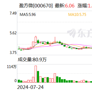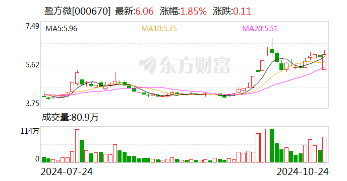 10月24日开盘后,盈方微股价一度跌超9%,此后公司股价逐渐回升。截至收盘,公司股价收于6.06元/股,涨幅为1.85%,总市值约为51亿元。