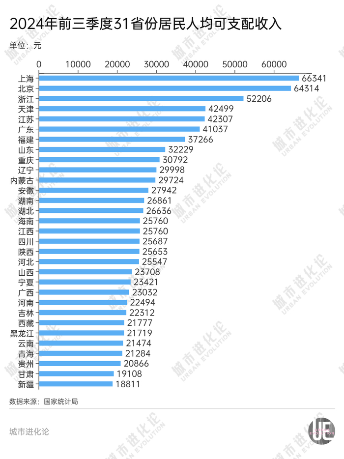 分省份来看,上海和北京领先优势明显,其中上海前三季度居民人均可支配收入达到66341元,全国第一;北京紧随其后,前三季度居民人均可支配收入达到64314元,位居第二。