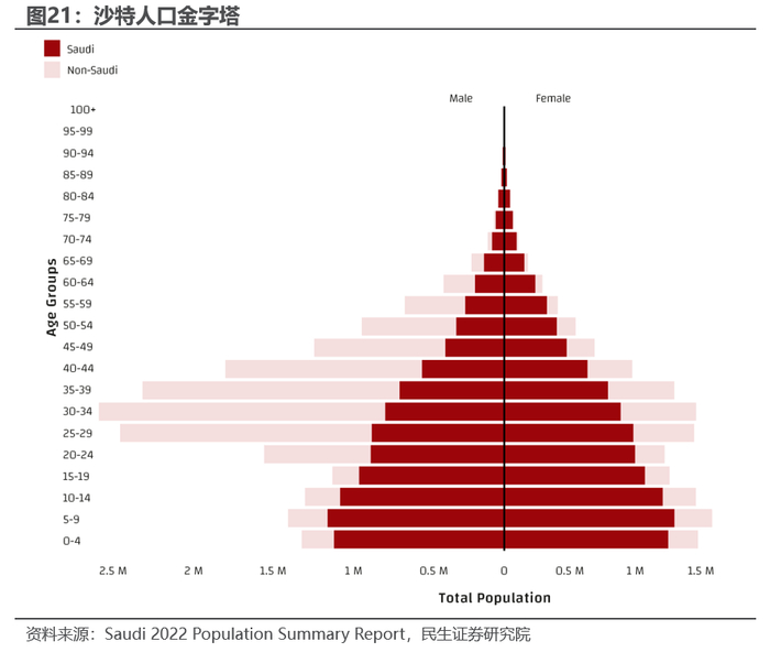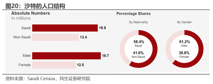 年龄结构来看,沙特阿拉伯是主要新兴市场中最年轻的国家之一,平均年龄为29岁(中位数25.4岁)。当前沙特30岁以下人口占比51.8%(中国为 34.8%),超过人口总数的一半;而 65 岁及以上的人口占比仅为2.7%(中国为8.4%)。沙特15-64岁处于劳动年龄的人口占比7.28,还要高于中国的69.0%。