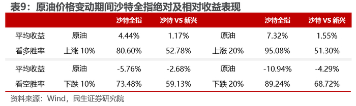 原油价格上行(下行)期间,看多(看空)沙特全股指数绝对收益的胜率赔率均高。当布伦特原油价格在40个交易日内上涨(下跌)10%时,沙特全股指数平均收益4.44%(-5.76%),胜率达80.6%(73.48%)。在40个交易日内上涨(下跌)20%时,沙特全股指数平均收益7.32%(-10.94%),胜率达95.09%(89.24%)。原油价格的变动对沙特全指相较新兴市场相对收益的表现也有影响,但是主要表现在原油价格下跌时看空沙特相对收益的胜率赔率较高。