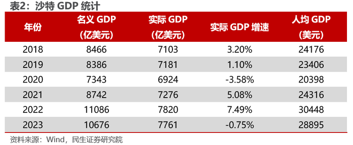 2023年沙特名义GDP达1.07万亿美元(4.00万亿里亚尔),世界排名第19,实际GDP增速约为-0.75%。