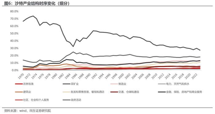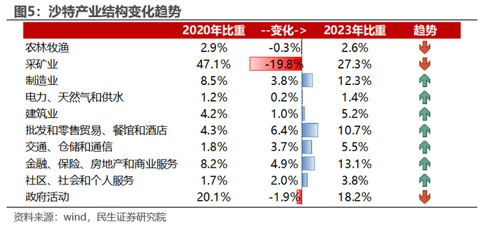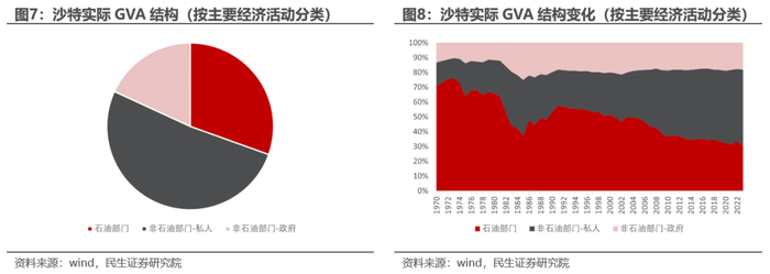 2023年石油部门产值占沙特经济的比重为30.5%,仍是沙特的核心支柱产业;私人部门的比重持续上升,经济体正谋求多元转型,非石油部门快速增长。