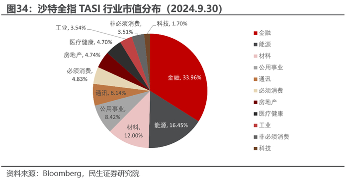 沙特的主要股指为沙特全指(TASI),其权重最高的四个行业依次为金融(33.96%)、能源(16.45%)、材料(12.00%)、公用事业(8.42%)。